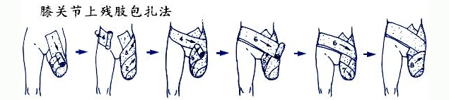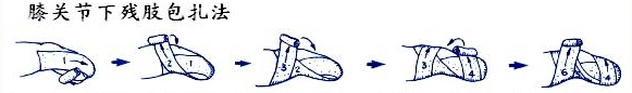 ● 小腿殘肢彈力繃帶包扎方法: ①前方從髕骨下方開(kāi)始,后方到腘窩部,至少往返2次 ②從后方折返繃帶,然后從內(nèi)向外環(huán)繞數(shù)次,以防繃帶滑脫 ③8字形環(huán)繞殘端尖部 ④用上圖的方式繼續(xù)纏繞,最后繞到股骨髁上部分 ⑤為了不影響關(guān)節(jié)活動(dòng)髕骨應(yīng)暴露在外 ⑥越靠尖端纏的越緊,最后在膝上方結(jié)束